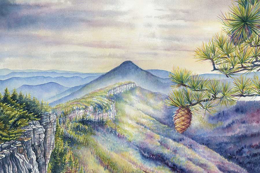 I highly recommend hiking North Fork Mountain Trail to see the view pictured in this painting. This stunning and unique vista is not far from Seneca Rocks and the Dolly Sods Wilderness Area. I love the spruce trees at the tops of these formations and had to make sure a spruce cone made it into the piece. This was the first of a set of paintings I created through 2021 that all have a spring feel and a similar blue, green, and lavender pastel element. This print will be 20% off now through February 28 - the discount will show in your cart.